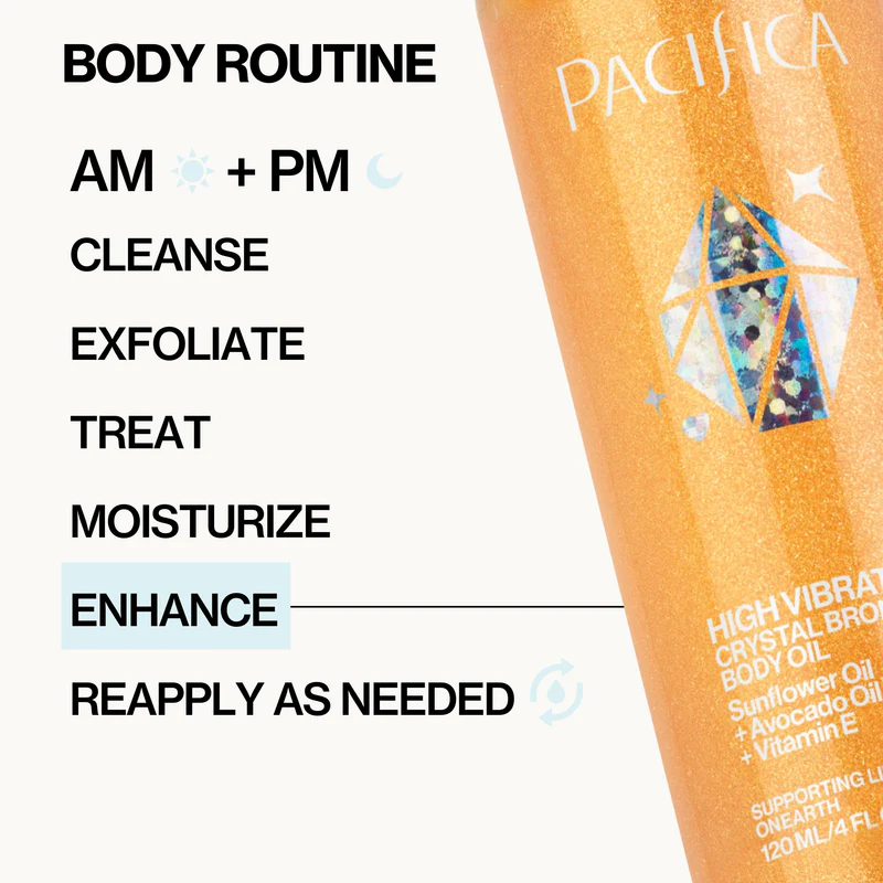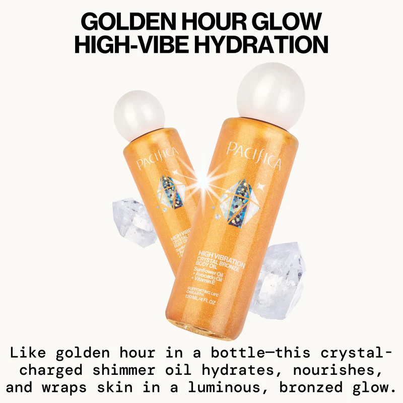 Like golden hour in a bottle—this crystal-charged shimmer oil hydrates, nourishes, and wraps skin in a luminous, bronzed glow.
